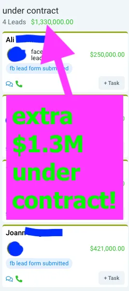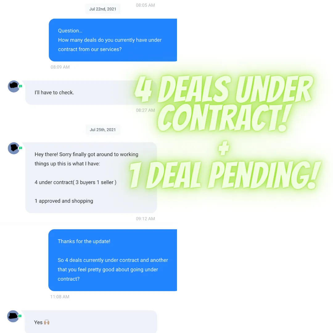 The end result is live transfers and booked appointments with pre-qualified leads which includes: full contact information (name, email, phone), timeline, price range, whether or not they have been pre-qualified through a lender, whether or not they're already working with a realtor..and more! You’ll get exclusive "real-time" lead generation, scrubbing, pre-qualification and follow-up...all without you ever being involved. This frees up your time to focus on "revenue generating activities...which lead to more closed deals for you!